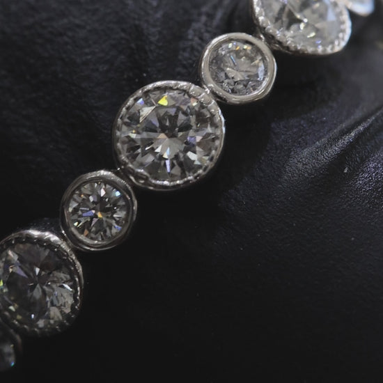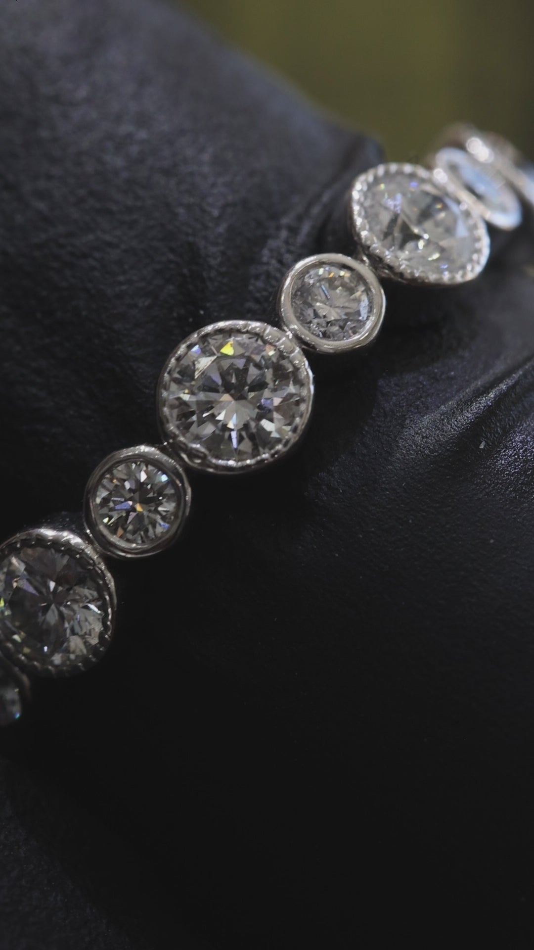 This diamond eternity band features alternating sizes of round brilliant diamonds, each securely bezel-set to create a smooth, contemporary silhouette with eye-catching dimension. Crafted in polished 14K white gold, the bezel settings enhance durability while allowing continuous brilliance around the entire band.