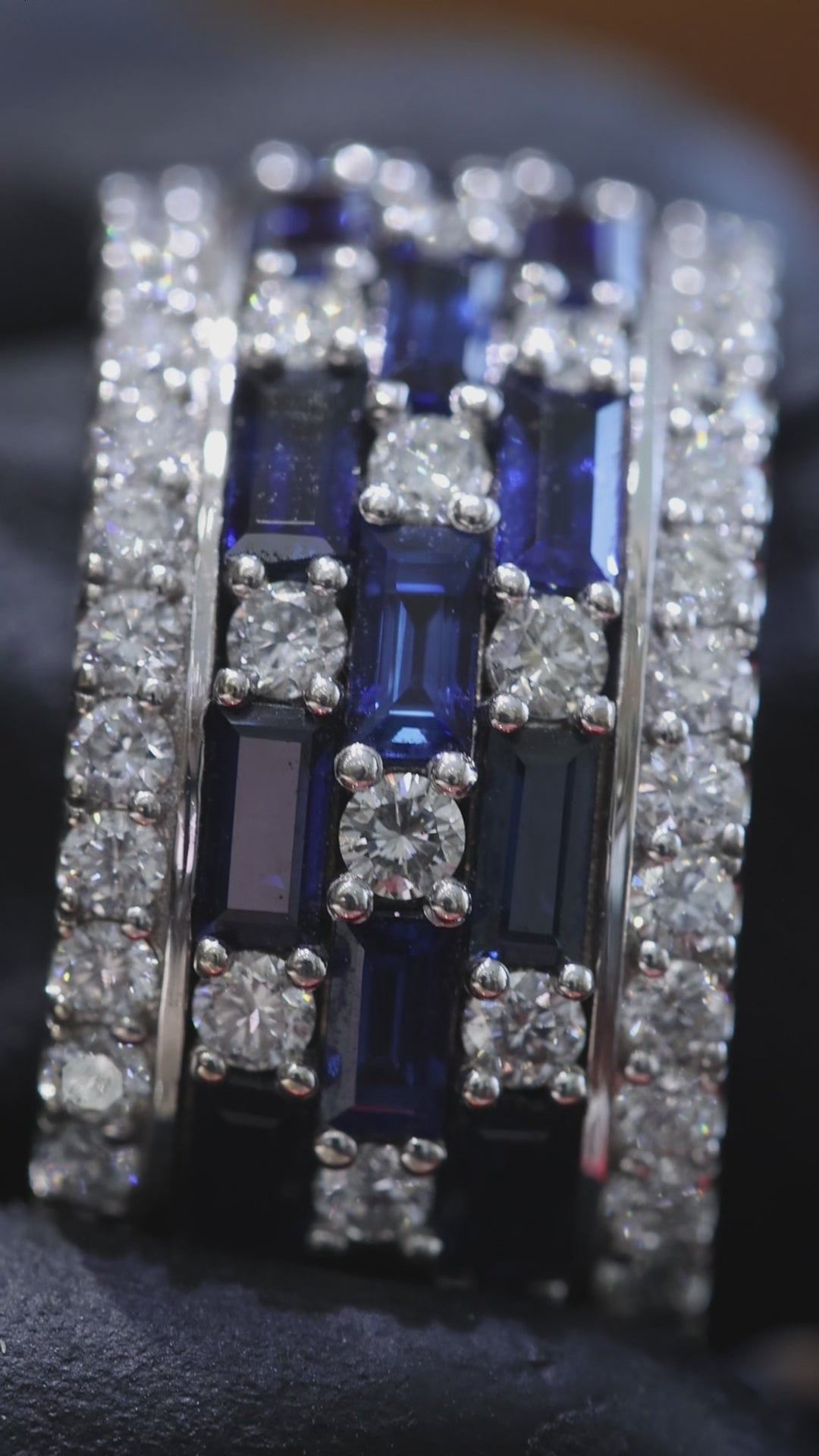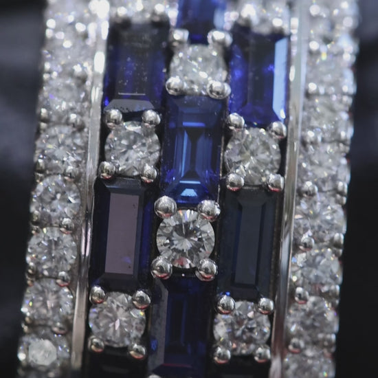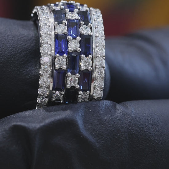This sapphire and diamond band features rich blue sapphires set in alternating rows with round brilliant diamonds, creating strong contrast and dimensional sparkle. Crafted in polished white gold, the structured multi-row design delivers a bold, modern look with refined elegance.