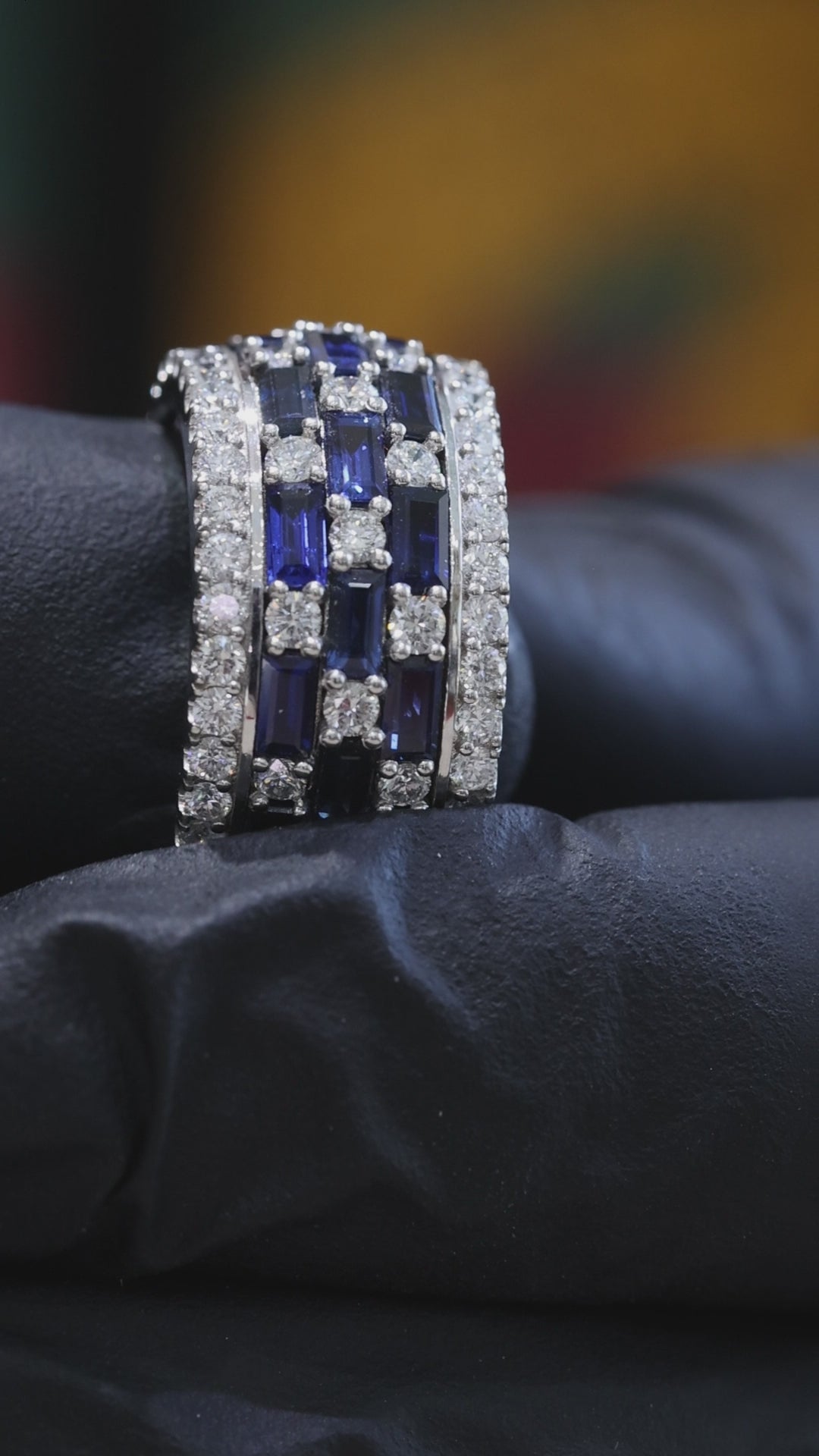 The combination of emerald-cut sapphires and round diamonds adds visual depth and symmetry, making this ring ideal as a statement band, anniversary ring, or right-hand piece.