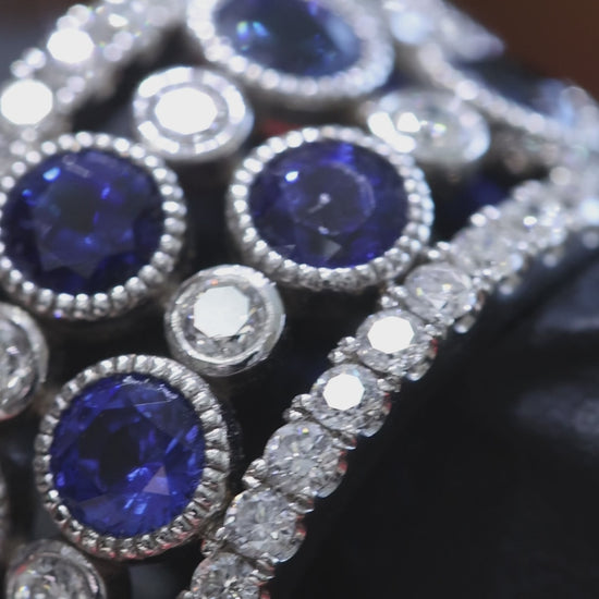 The structured multi-row layout highlights the vivid blue sapphires while the natural diamonds add continuous sparkle. This ring is ideal as a statement band, anniversary ring, or right-hand piece with bold elegance.