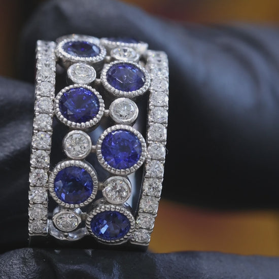 This sapphire and diamond wide band showcases rich blue sapphires alternating with round brilliant natural diamonds, accented by pavé diamond rows for added brilliance. Crafted in polished white gold, the layered design creates depth, contrast, and a strong visual presence.