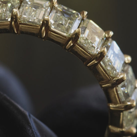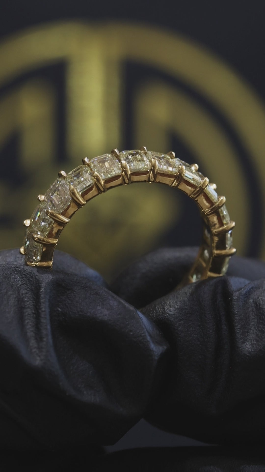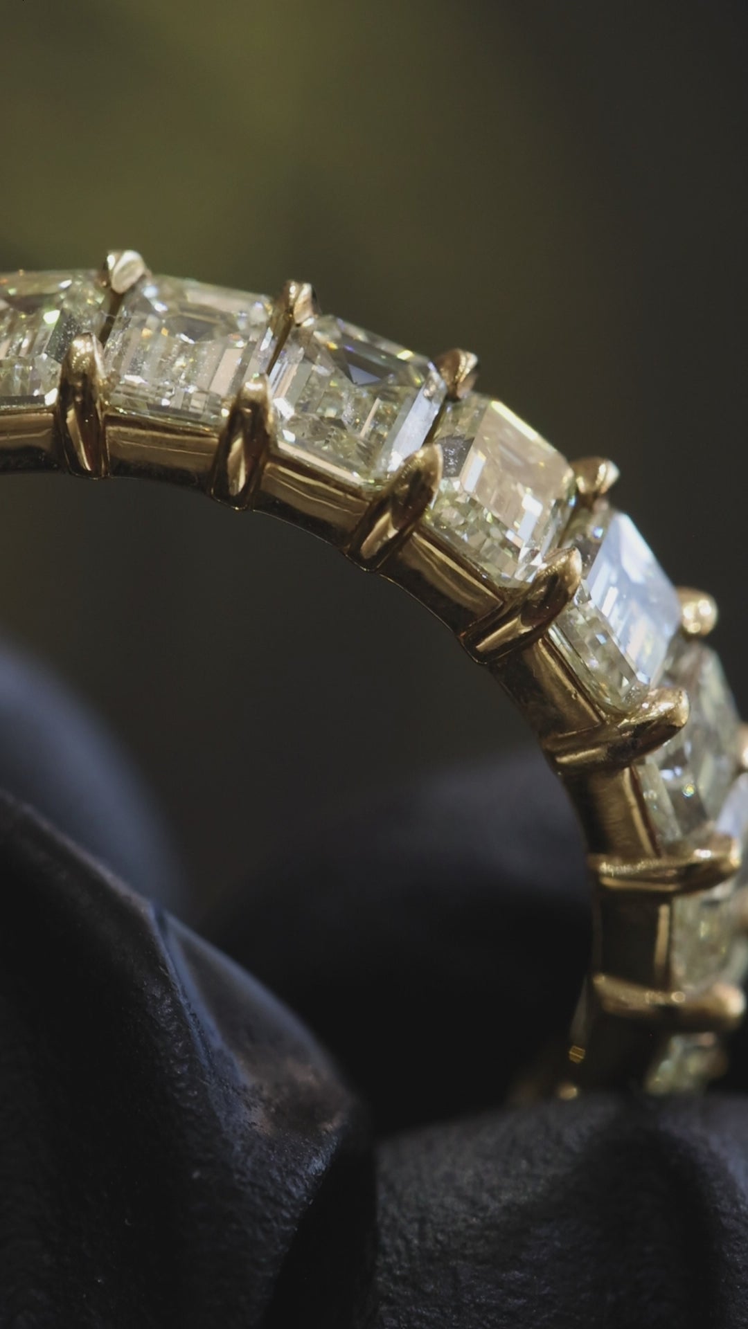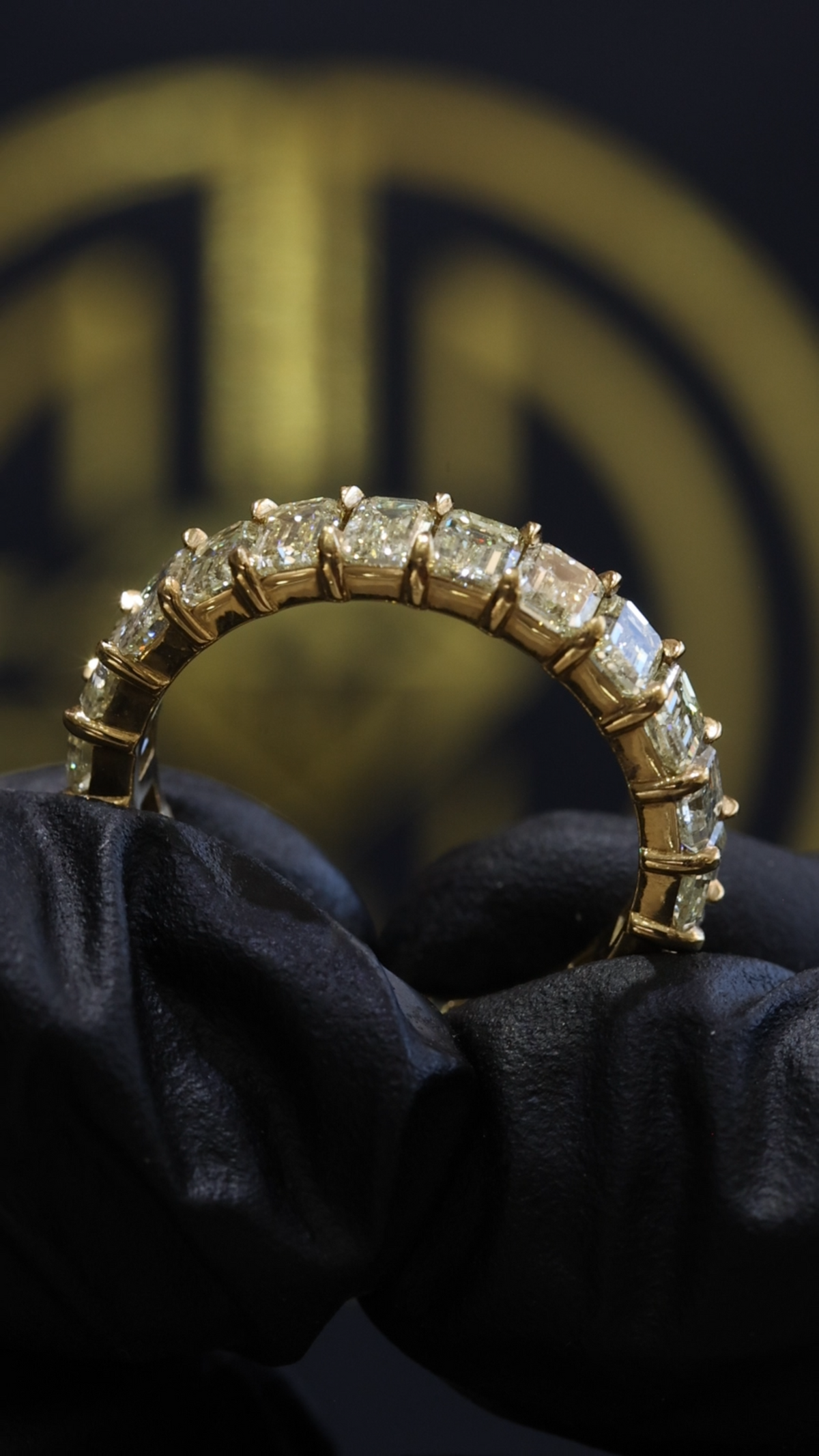 Designed for those who appreciate clean lines and elevated craftsmanship, this emerald cut eternity band delivers striking brilliance with a modern, sophisticated presence. Wear it alone for a bold look or pair it with engagement rings for an elevated stack.