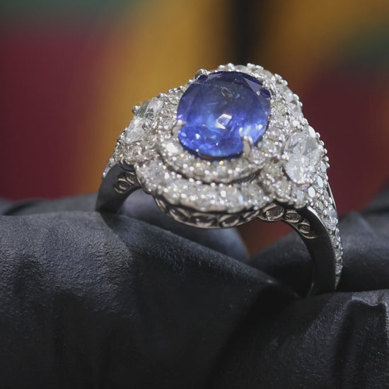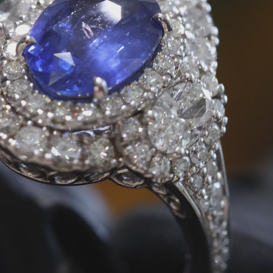 Oval Blue Sapphire Double Halo Ring with Diamond Accents | 4.41 CTW