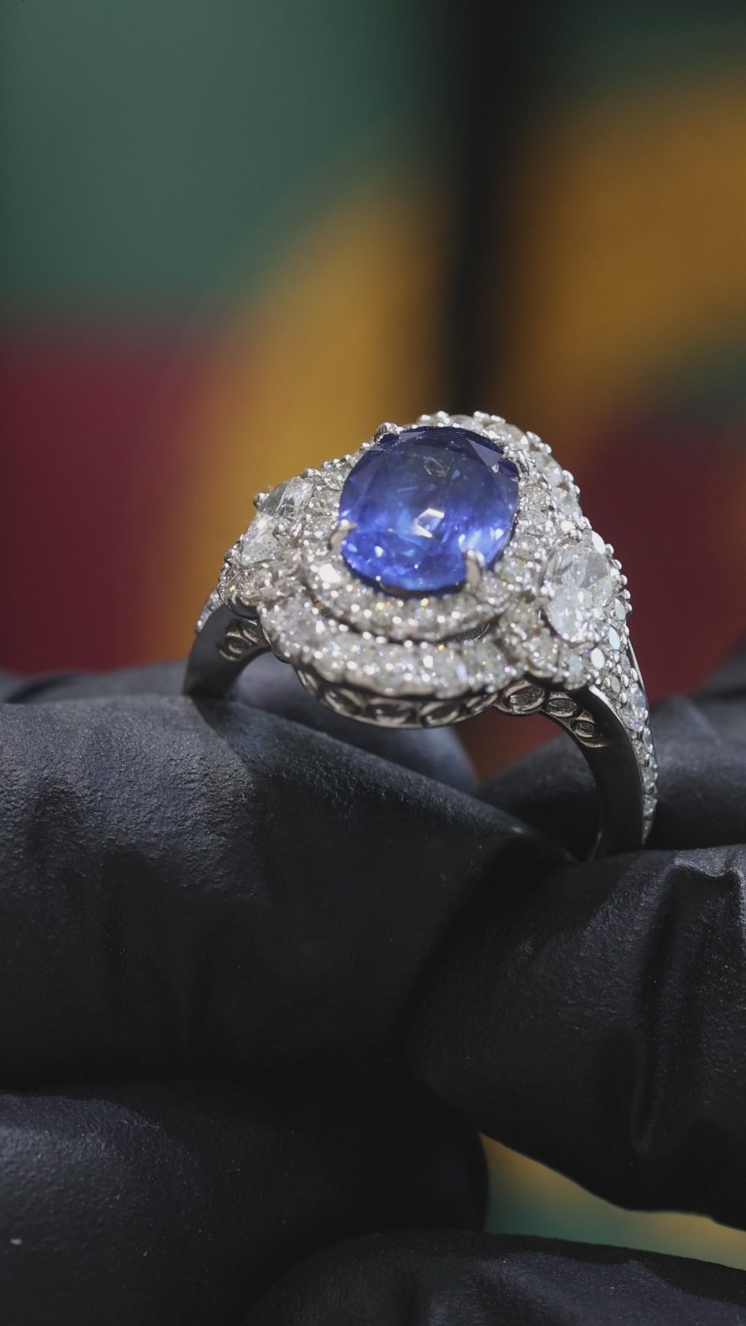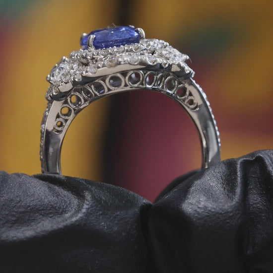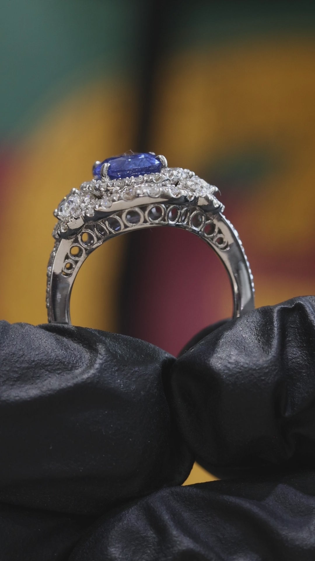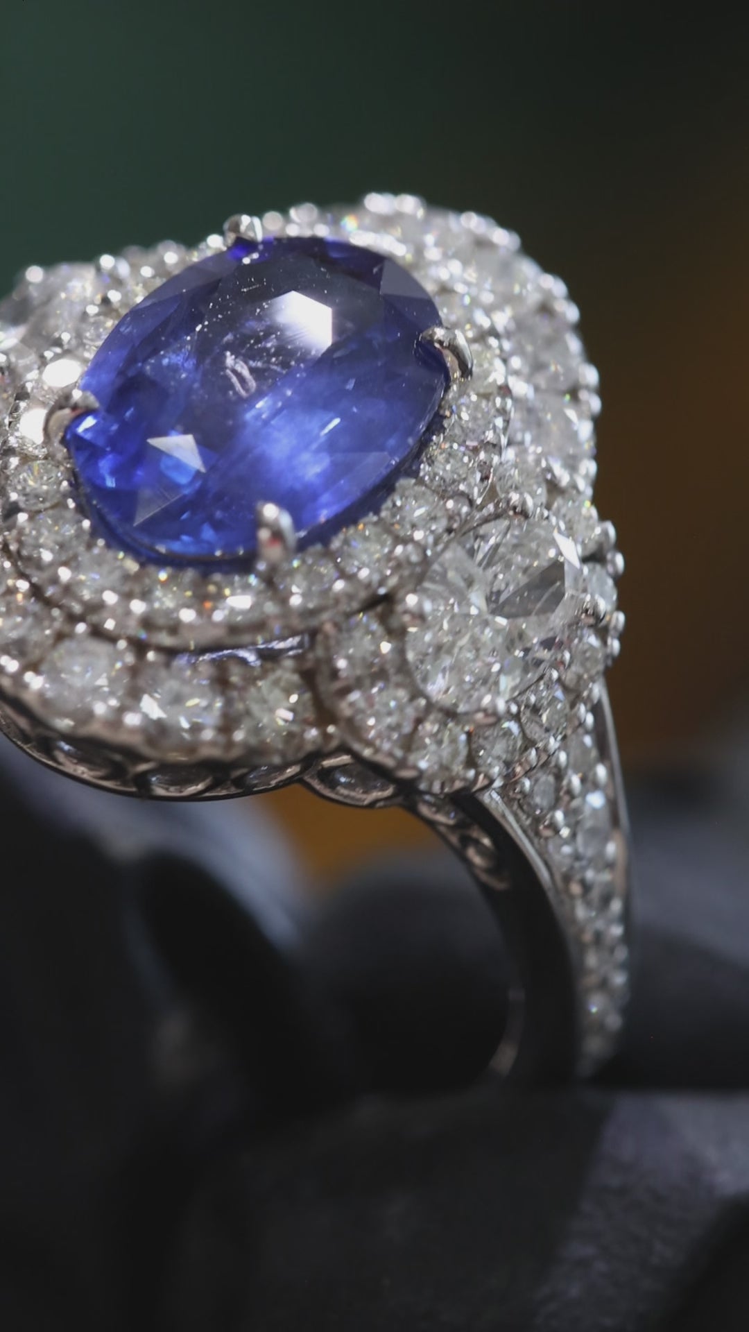 This elegant sapphire ring showcases a vivid oval-cut blue sapphire surrounded by a double halo of natural round brilliant diamonds, creating exceptional depth and brilliance. The layered halo design enhances the sapphire’s color while adding a luxurious, high-impact presence.