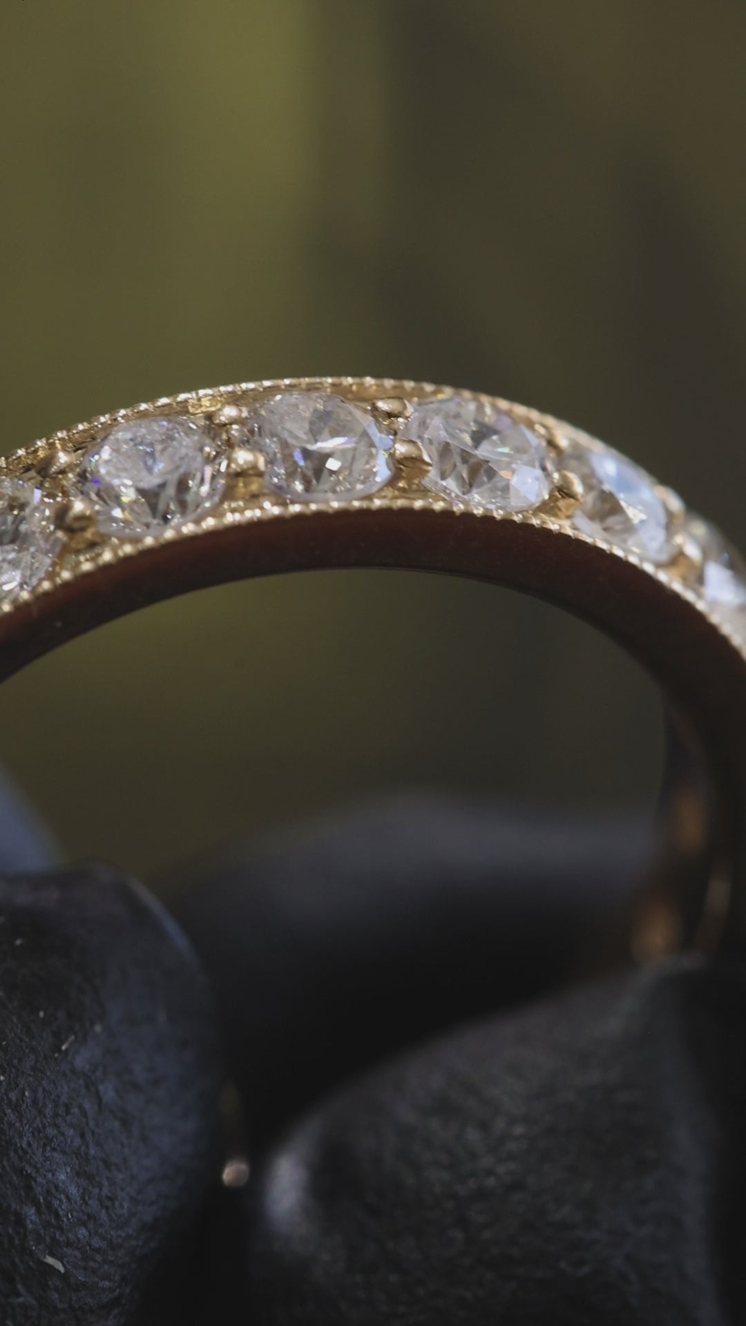 This diamond eternity band features round brilliant diamonds set continuously around the band in a refined shared-prong setting, accented by subtle milgrain edge detailing for added texture and definition. Crafted in rich 14K yellow gold, the clean lines and balanced proportions deliver timeless brilliance with elevated craftsmanship.