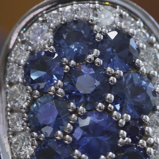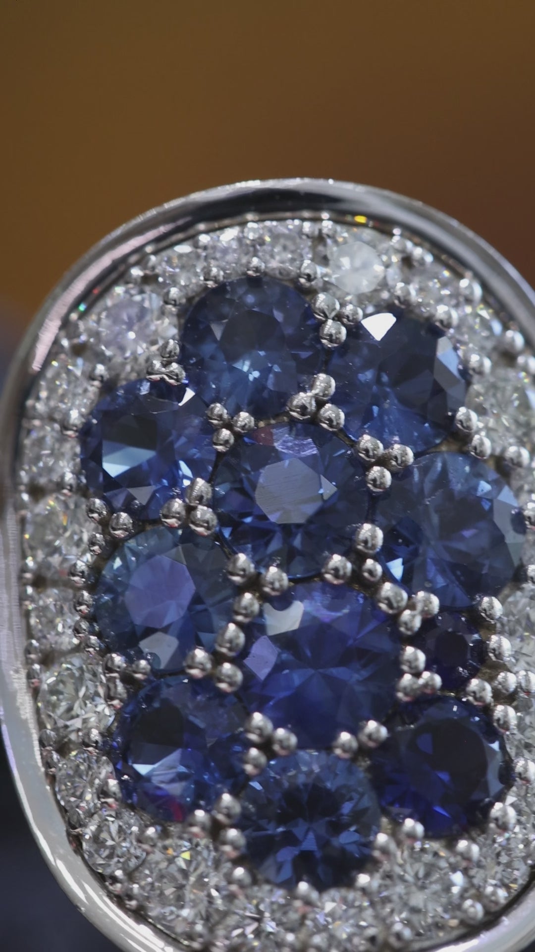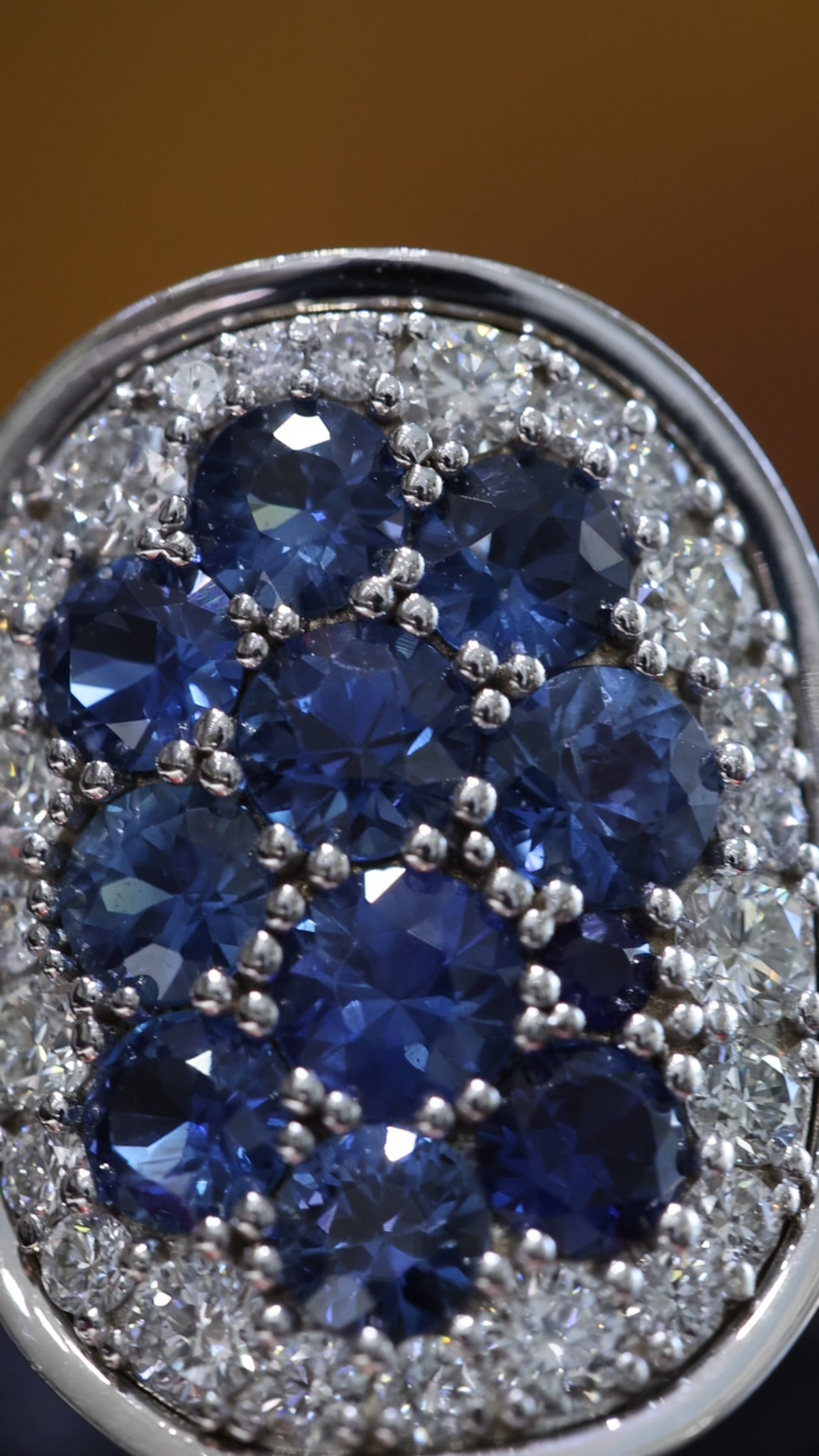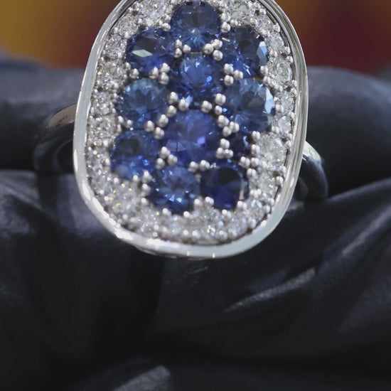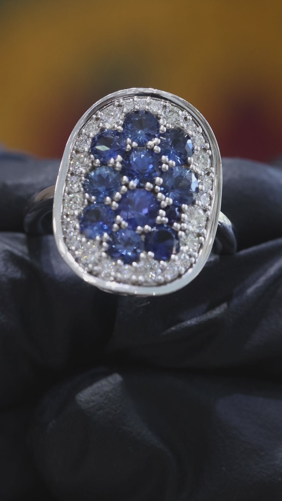 This sapphire and diamond ring features a vivid blue sapphire cluster center framed by a sparkling diamond halo, creating depth, brilliance, and strong visual presence. Crafted in luminous 14K white gold, the elevated halo design enhances the size and color of the sapphires while providing exceptional sparkle from every angle. A refined yet statement-making piece designed to stand on its own.