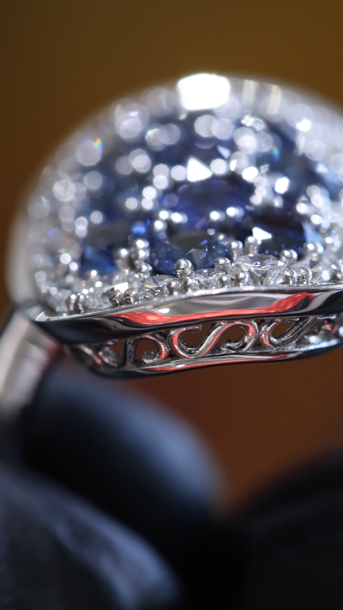 • Ring Design: Cluster halo with elevated gallery and polished shank